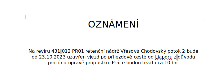 Na revíru 431 012 PR01 retenční nádrž Vřesová Chodovský potok 2 bude od 23.10.2023 uzavřen vjezd po příjezdové cestě od Liaporu